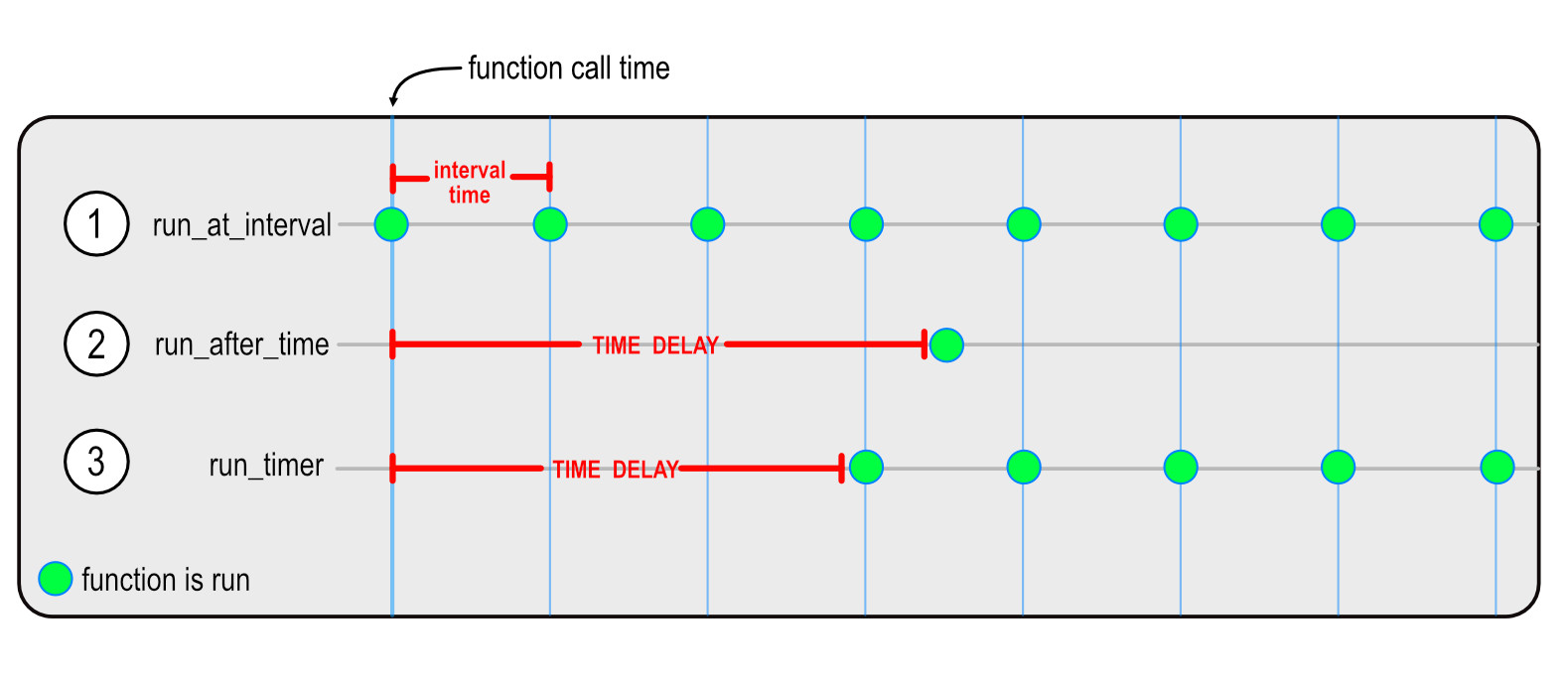 Functions that run periodically at user-defined intervals after an initial delay period (run_timer).