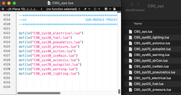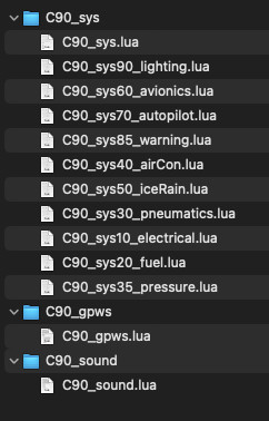 This is why, in the example below, that the C90_sys10_electrical.lua file is "dofiled" first, because a lot of the code in the other Lua files that follow need access to the data in the electrical Lua file. Some authors will use numbers as part of their Lua filenames simply to make the alphabetical order of the files match the dofile order, but this is simply for convenience.
