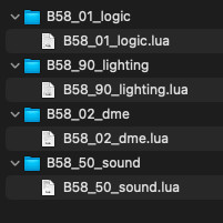 Most small projects will probably utilize one Lua file per module as described in the Package Organization chapter. X-Plane's default Beech Baron scripts are organized in this way (see below) with four modules. You can see that each module name (mostly) reflects its logical function, i.e. lighting, sound, dme etc.