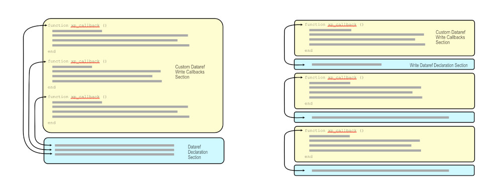 In the style at left, all the write callbacks for custom datarefs are included in the same section, and all the custom datarefs are declared in their own section after. This has the benefit of letting you quickly create and easily see all your custom datarefs together in a compact list, at the expense of putting each of their associated write callbacks "further away" in the file. In the style at right, each custom dataref callback is placed directly above its dataref definition. This has the benefit of keeping a custom dataref's callback right next to its declaration, but makes it more difficult to see all your custom datarefs collectively when the list gets long. Either/or, this is simply a stylistic preference and you should use whichever is easiest for you to comprehend. Some people like to see all their custom datarefs together, others like to see the dataref next to its write callback. In either style though, the write callback function (yellow) needs to precede its custom dataref declaration (blue).