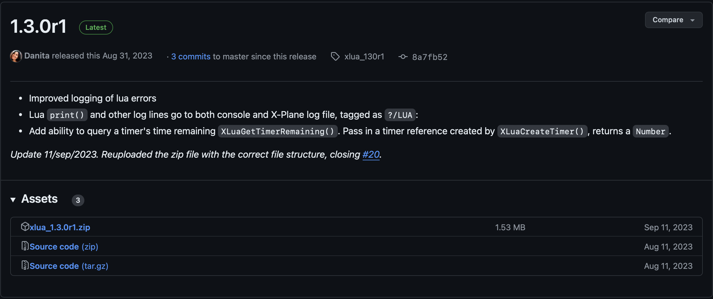 OPTION 2: Download it from github.com. The latest and greatest version of XLua can always be obtained through XLua's Github Repository page. On the right side of the main repo page, look for the [Releases] section, click the latest button, then on the following page, download the latest *.zip file. As of this writing, the latest version is 1.3.0r1 as shown below. You can also click the image below to download the Version 1.3.0 package directly, unzip and copy it to your aircraft folder.